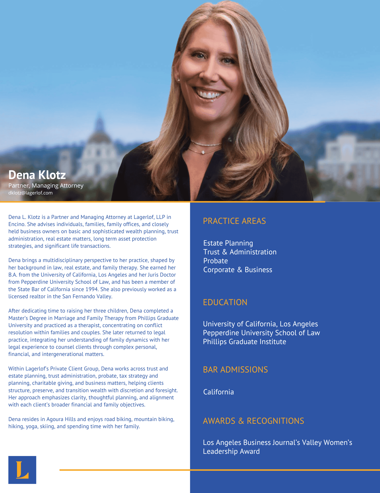 Dena L. Klotz is a Partner and Managing Attorney at Lagerlof, LLP in Encino. She advises individuals, families, family offices, and closely held business owners on basic and sophisticated wealth planning, trust administration, real estate matters, long term asset protection strategies, and significant life transactions.